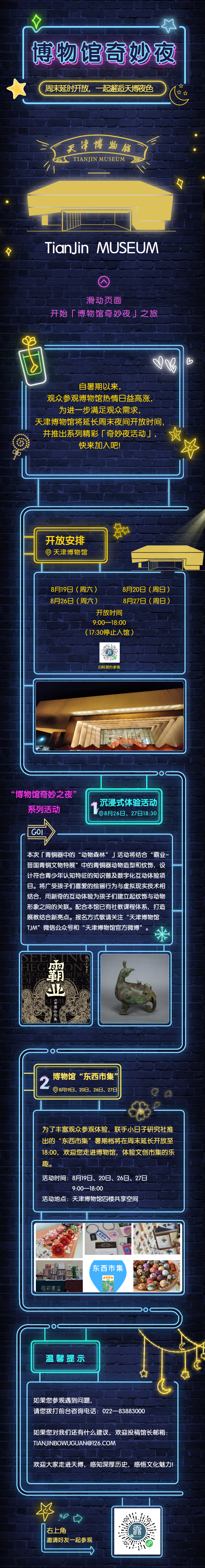 自暑期以来,观众参观博物馆的热情日益高涨,为进一步满足观众的参观需求,更好地回馈广大观众对天津博物馆的厚爱,特延长周末开放时间,并推出一系列精彩的「博物馆奇妙夜」活动,快来加入吧!