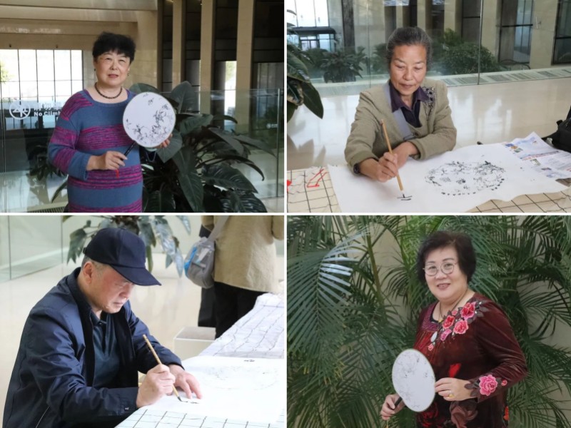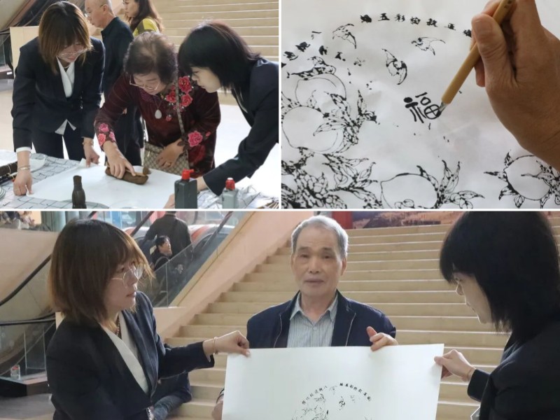 一同拓印团扇,掌握木板画拓印技术。天博社教老师向大家讲解拓印步骤,指导老年观众朋友们在文扇上拓印出粉彩五福八桃的纹样,并写上福寿等祝福词汇。虽然爷爷奶奶们都是第一次亲手绘制中国画,但他们仔细认真地画好每一笔,经过一个多小时创作,每位老年观众朋友们都完成了精美又富有吉祥寓意的团扇。活动结束后,大家拿着自己亲手绘制的“艺术品”拍照留念,纪念这个别具意义的重阳节。