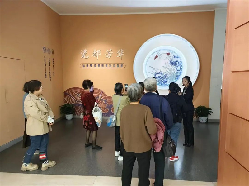 天博社教老师陪伴老年观众朋友们走进展厅,了解传统吉祥文化。首先以天博馆藏文物“清雍正款粉彩五蝠八桃过枝纹盘”为切入点,向老年观众朋友们介绍了粉彩的基本概念及彩绘方法,并解释了器物所绘纹饰的吉祥文化内涵,即蝙蝠的“蝠”谐音“福”,寓意幸福安康;“桃”代表长寿;二者结合在一起象征“福寿双全”、“多福多寿”的吉祥寓意,向老年观众朋友们送去节日的祝福。
