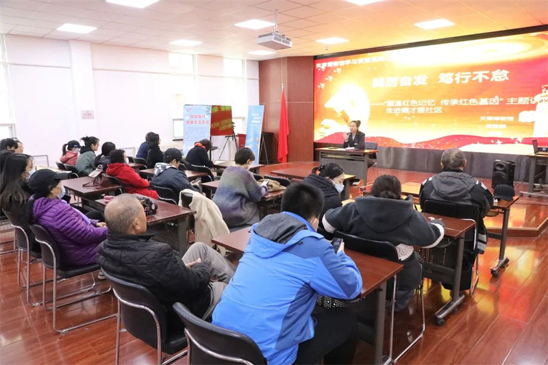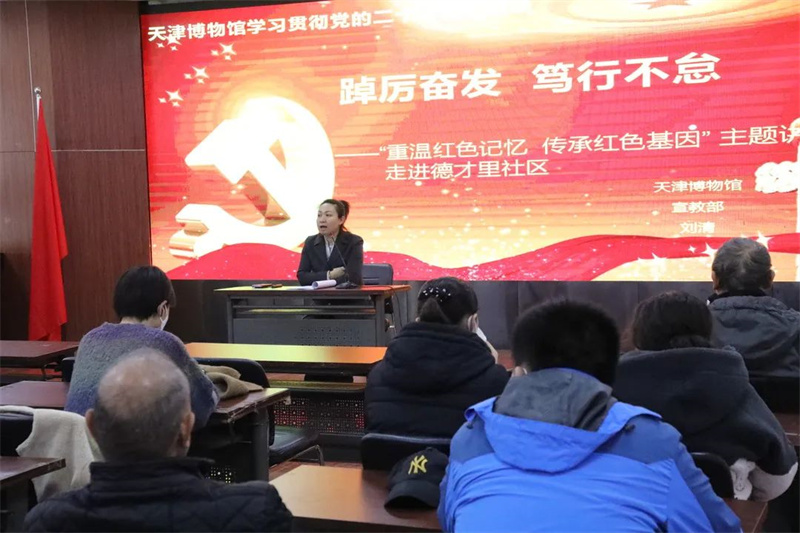 天津博物馆坚持以人民为中心的发展思想,积极开展“七进”活动,将优秀展览和讲座送进社区、学校、企业、乡村军营、机关、网络,打通宣传群众、教育群众、关心群众、服务群众的最后一公里,让老百姓充分享受到公共文化资源的福利。11月15日,天博社教小分队走进河西区德才里社区,为社区观众带来“重温红色记忆 传承红色基因” 主题讲座。社教专员将《踔厉奋发 笃行不怠——天津博物馆深入学习党的二十大精神》与《红色记忆——天津革命文物展》内容相结合,将展览内容、时事热点浓缩为一场生动的讲座,深受社区居民的欢迎。