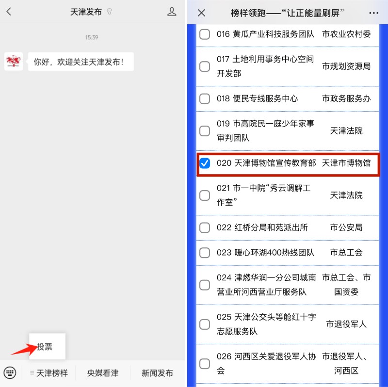 点击底部“天津榜样”-“020 天津博物馆宣传教育部”按钮进行投票,最多分别选择您支持的40个团队和40个项目,点击“投票”即可。