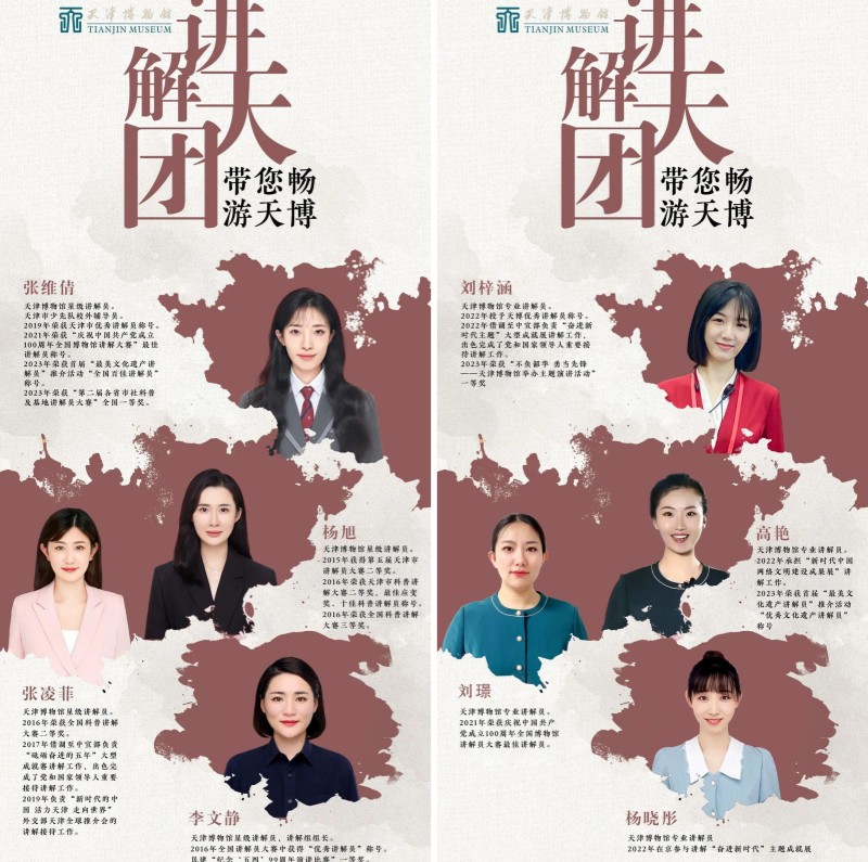 讲解员作为弘扬天津历史文化的主力军,用饱满的热情、专业的态度,为每一位走进天津博物馆的观众架铸起沟通历史与现代的桥梁。天博宣传教育部的讲解员队伍伴随天津博物馆的创新与发展,不断传承、壮大、成长,被观众亲切地称为天博“讲解天团”。