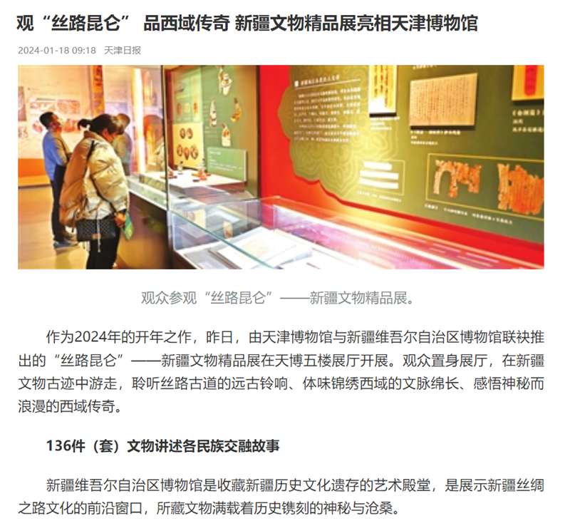 该展一经推出,受到广大观众的关注和新闻媒体的支持报道,新华社、中国新闻网、天津日报等媒体纷纷报道,其中新华网浏览量超55万,中国新闻网浏览量达56万。欢迎大家走进展厅,看各民族交往交流交融的故事,感受神秘而浪漫的西域传奇。