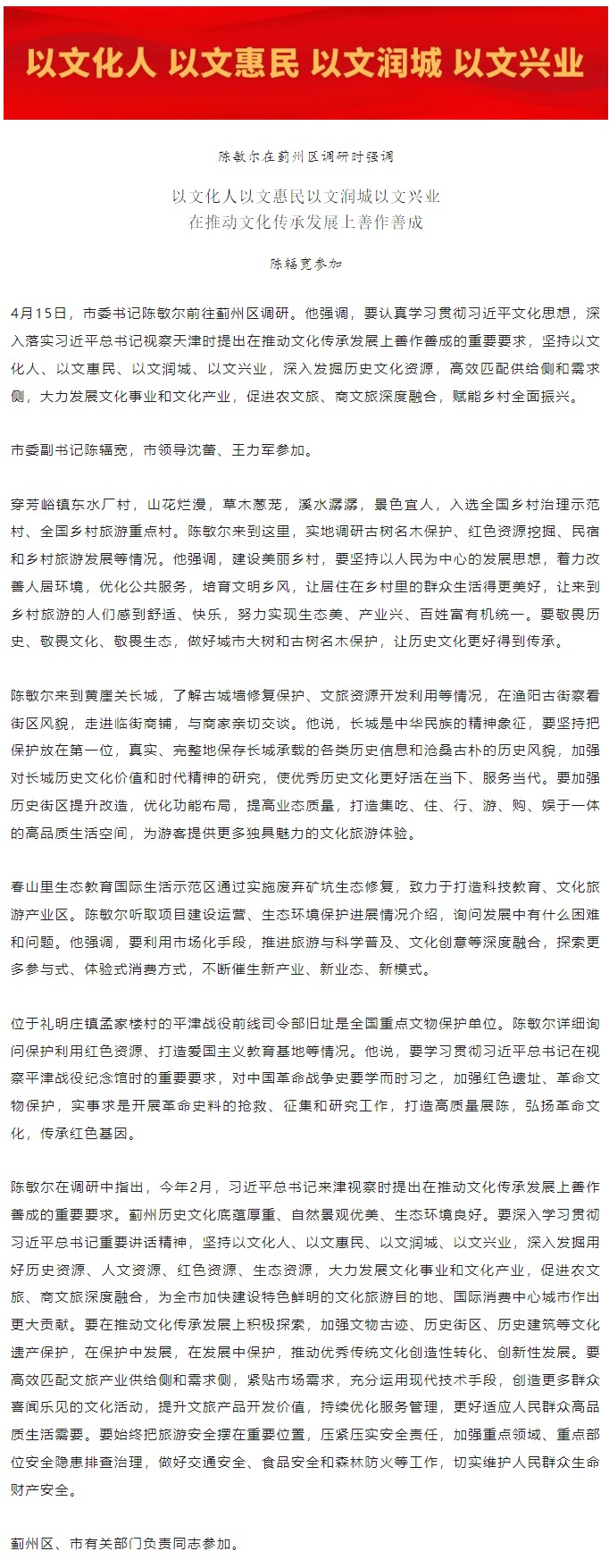 陈敏尔在蓟州区调研时强调:以文化人以文惠民以文润城以文兴业,在推动文化传承发展上善作善成