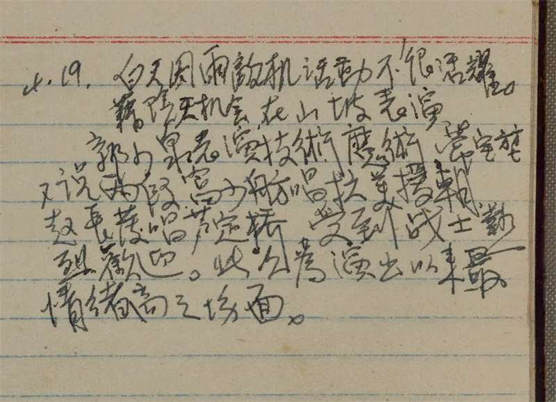 4月17日,前线表演……一半就闭会了,因表演的地方在一山沟树林内,飞机多得很,照明弹十几个正放在吾们头上,照如白日。