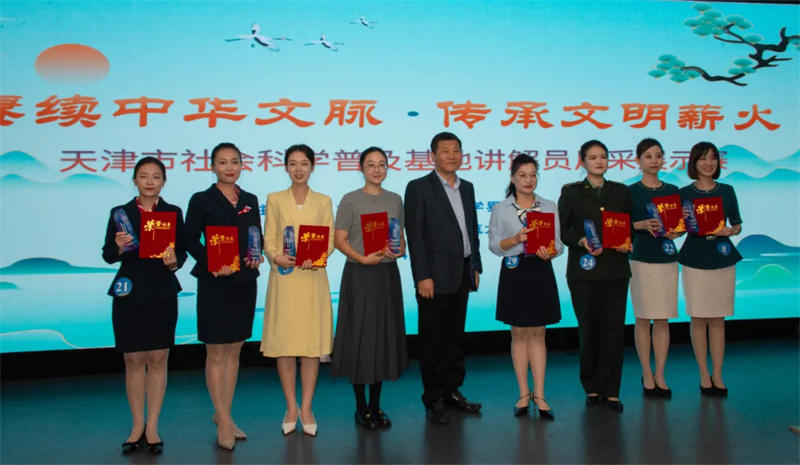 9月27日,由天津市社科联主办的社会科学普及基地讲解员风采展示赛在中国民航大学学术交流中心圆满举行。经过层层筛选,来自20个社科普及基地的35名讲解员选手脱颖而出,同台竞技,围绕活动主题以新颖的讲解方式,生动的讲解内容,精湛的讲解技巧,充分展现了新时代社科普及基地讲解员的风采,为现场观众呈现了一场精彩绝伦的比赛。天津博物馆讲解员张凌菲、刘梓涵、杨晓彤发挥出最佳水平,用专业的讲解,获得全场一致好评。张凌菲荣获一等奖,刘梓涵和杨晓彤分获二等奖。