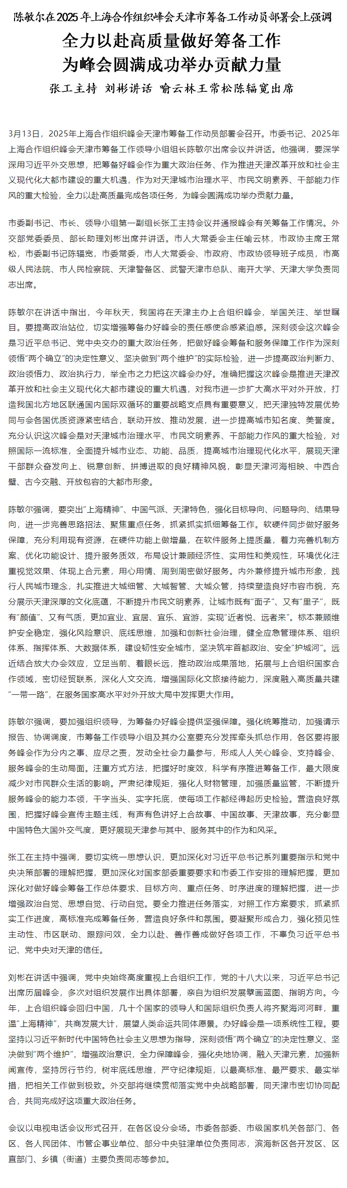 陈敏尔在2025年上海合作组织峰会天津市筹备工作动员部署会上强调:全力以赴高质量做好筹备工作,为峰会圆满成功举办贡献力量