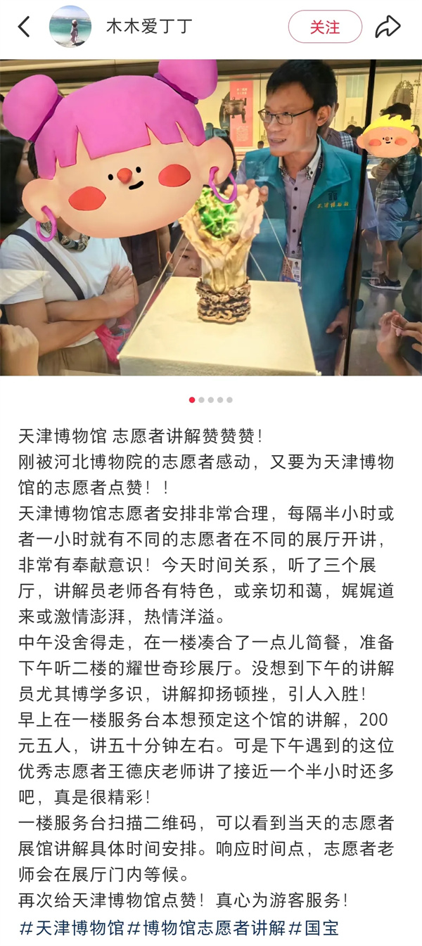观众们也表达了对天博志愿者讲解安排的喜爱,表示志愿者老师讲解内容深入浅出、生动有趣,引人入胜。