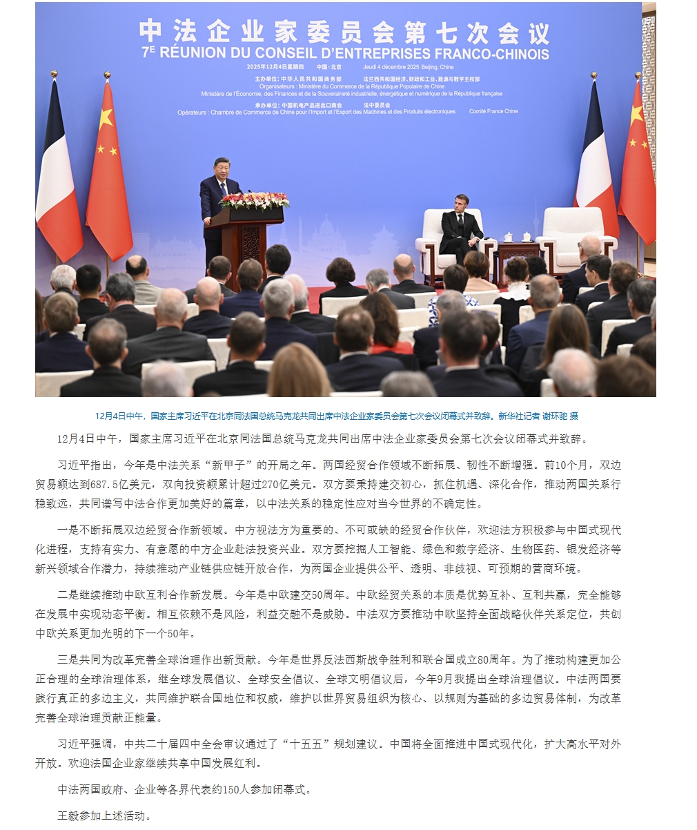 习近平出席中法企业家委员会第七次会议闭幕式并致辞