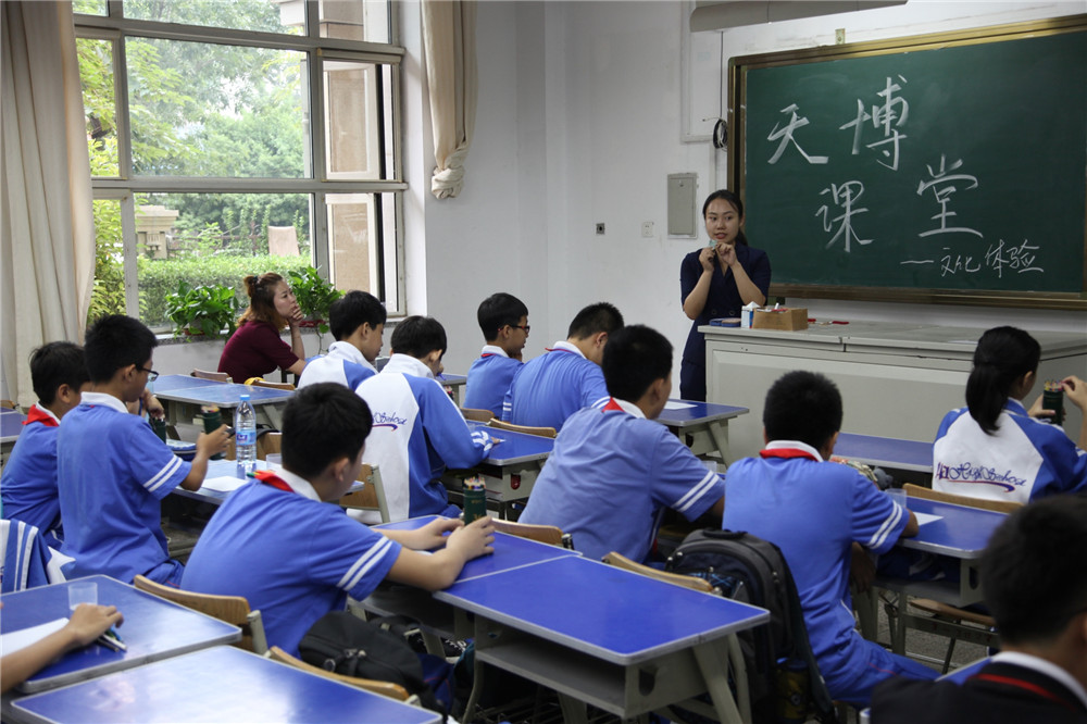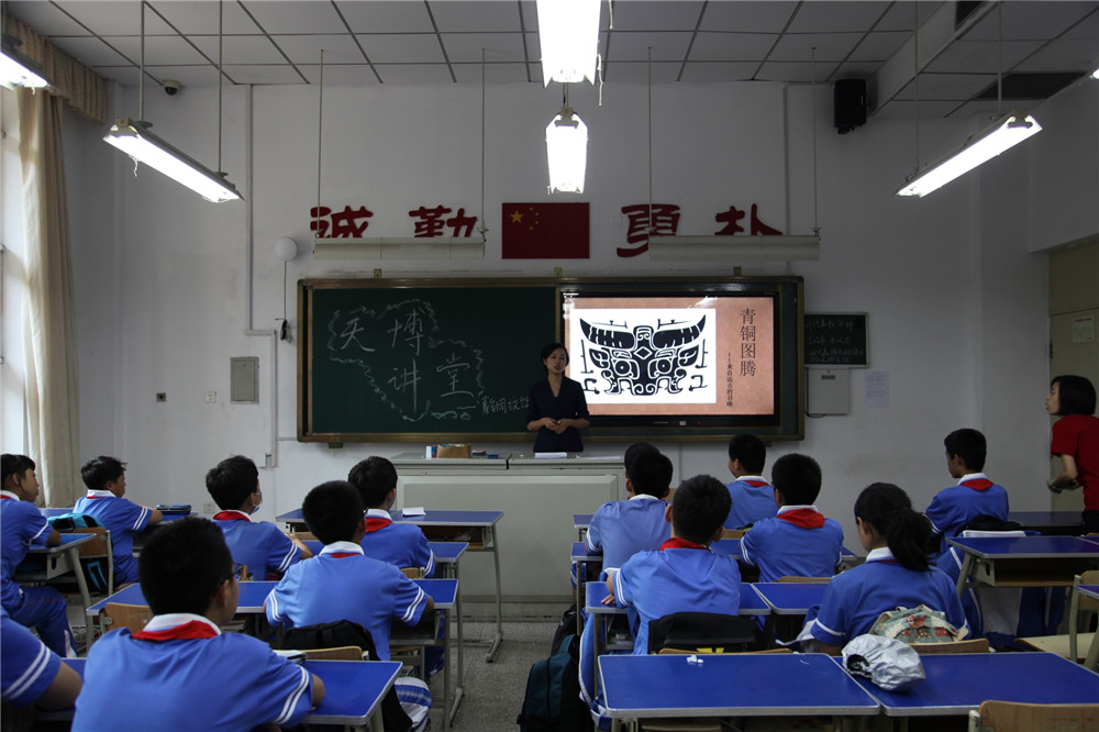 9月12日,“天博课堂之青铜图腾”在41中学开讲,由天博讲解员为学生们介绍青铜器的发展历史,介绍青铜器纹饰的产生背景及演变,并简要解读了17种常见的青铜纹样及其用途,通过丰富的图片资料帮助学生们辨识青铜纹饰。