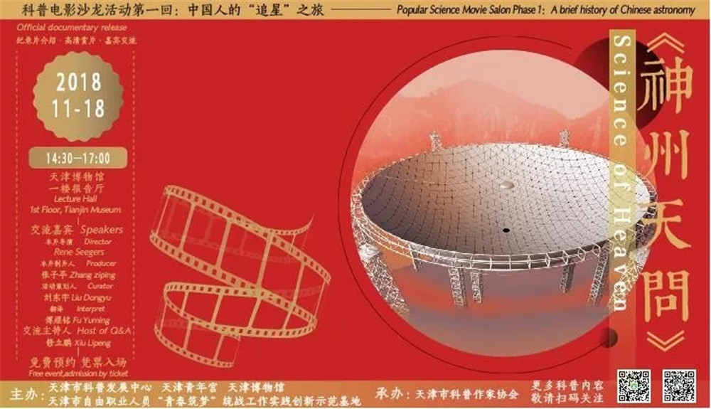 11月18日(星期日)14:30-17:00,由天津博物馆、天津青年宫、天津市科普发展中心和天津市自由职业人员“青春筑梦”统战工作实践创新示范基地主办,天津市科普作家协会承办的《中国人的“追星”之旅》电影沙龙将在天津博物馆一楼报告厅举办。
