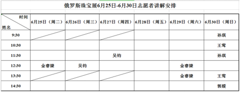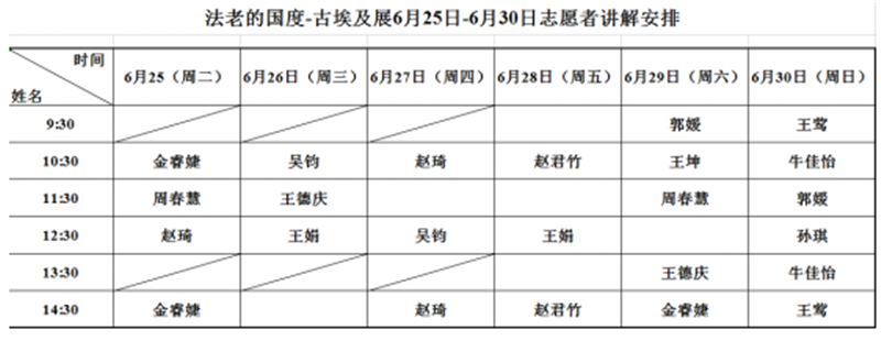 为提升天津博物馆的文化服务水平,方便广大观众地参观,天津博物馆将组织志愿者讲解员为大家倾情讲解,讲解展厅为四楼“法老的国度——古埃及文明展”和“珠宝锦匣——俄罗斯民族博物馆18-20世纪珠宝展”展厅,现将6月25日至6月30日讲解时间安排公布于下,请大家协调好自己时间,有序参观展览。