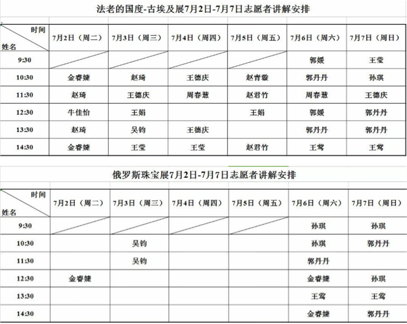 为给广大观众带来更好的参观体验,我馆组织志愿者长期提供公益讲解服务。应广大粉丝要求,提前获取临时展览具体讲解时间,现将7月2日至7月7日志愿者讲解安排公布于下。