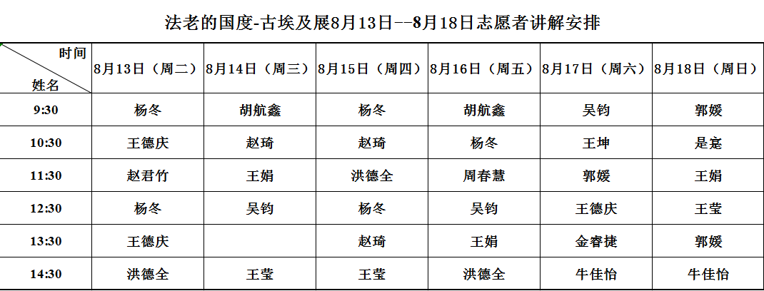 “法老的国度”展览开展以来,参观人群络绎不绝,日参观人数屡创新高,天博志愿者的讲解服务也广受观众好评。8月13日至8月18日,天津博物馆将继续为广大观众提供临时展览公益讲解服务。本期公益讲解主要围绕“法老的国度——古埃及文明展”开展。