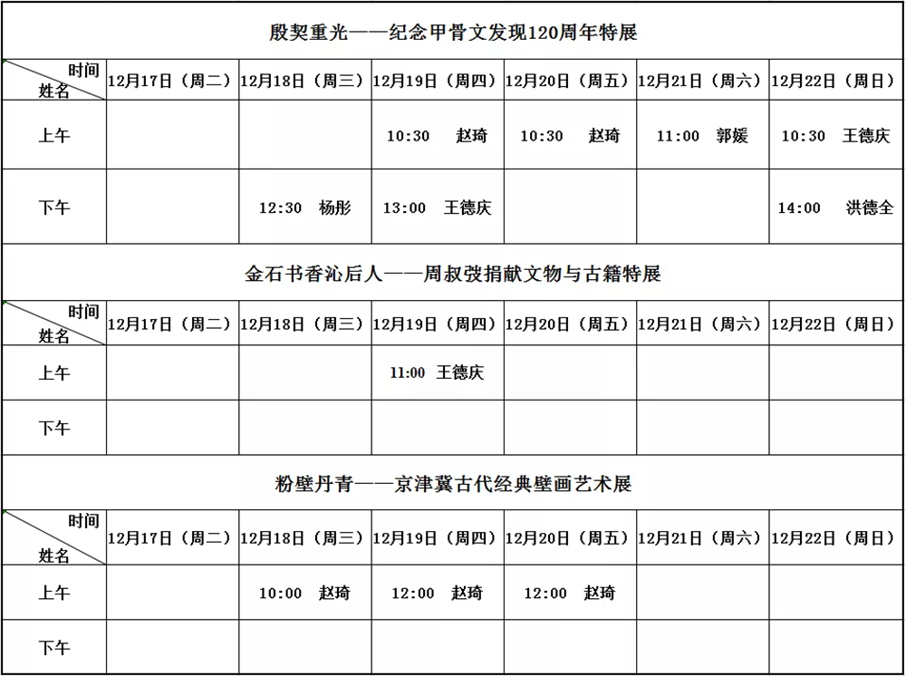 “敢教日月换新天——庆祝中华人民共和国成立70周年馆藏经典绘画特展”、“殷契重光——纪念甲骨文发现120周年特展”、“金石书香沁后人——周叔弢捐献文物与古籍特展”、“粉壁丹青——京津冀古代经典壁画艺术展”自开展以来,受到广大观众的好评,为带给大家更好的观展体验,现将2019年12月17日—12月22日的志愿讲解安排公布于下,请大家根据自身情况合理安排参观时间,文明有序参观。