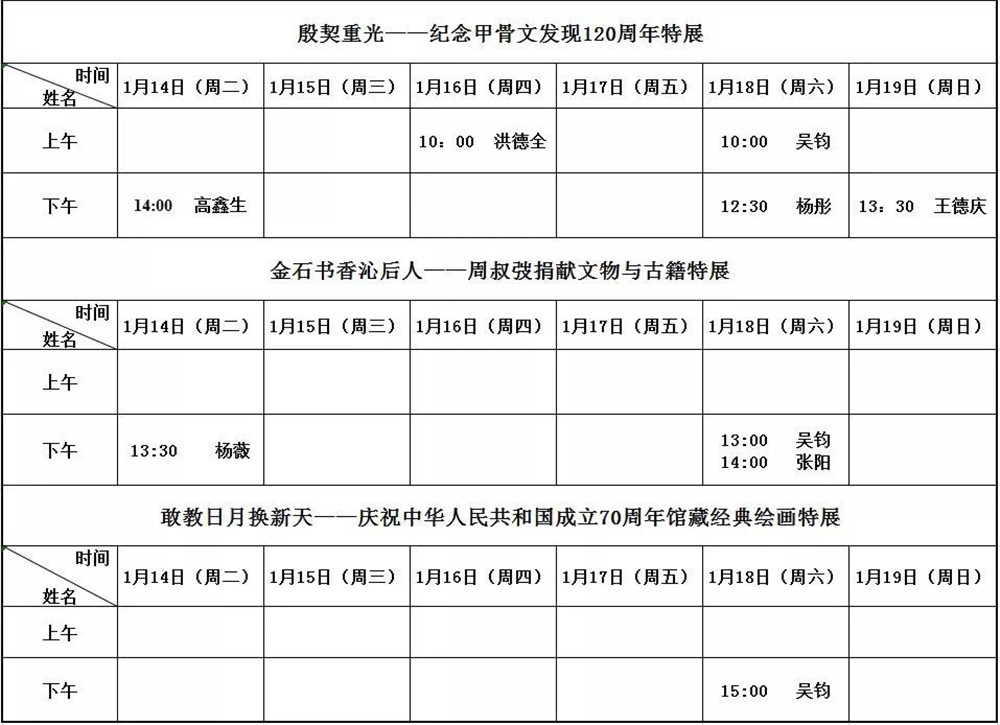 殷契重光——纪念甲骨文发现120周年特展”、““敢教日月换新天——庆祝中华人民共和国成立70周年馆藏经典绘画特展”、金石书香沁后人——周叔弢捐献文物与古籍特展”、“粉壁丹青——京津冀古代经典壁画艺术展”自开展以来,受到社会各界广泛关注。为给广大观众带来更好的参观体验,我馆组织志愿者长期提供公益讲解服务。应广大粉丝要求,提前获取临时展览具体讲解时间,现将2020年1月14日—2020年1月19日志愿者讲解安排公布于下。请大家根据自身情况合理安排参观时间,文明有序参观。