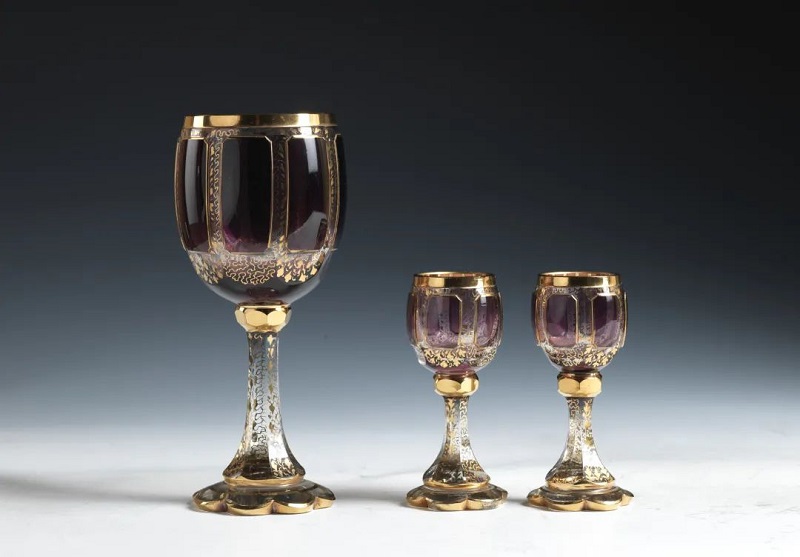 意大利 十九世纪末二十世纪初 透明蓝色镀金玻璃镶红蓝宝石酒杯 透明烟灰色镀金玻璃镶红蓝宝石酒杯
