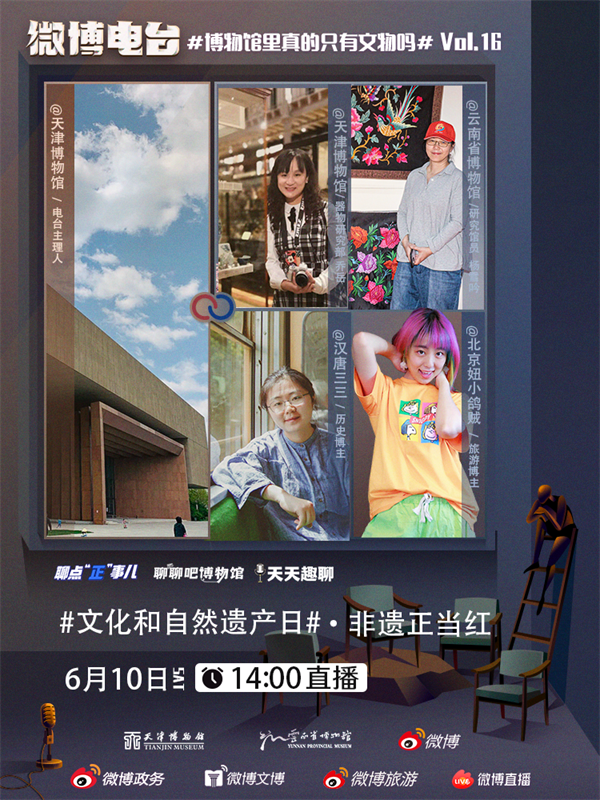 国风流行、国货热销、“国潮”涌动,近年来中国传统文化、中国非遗越来越受到当代人的关注与喜爱。天津博物馆官方微博推出“非遗正当红”直播活动,邀请三位文旅专家和观众一起云游天博,了解全国各地丰富多彩的文化和自然遗产,畅聊博物馆在文化遗产传承与发展中的重要作用。
