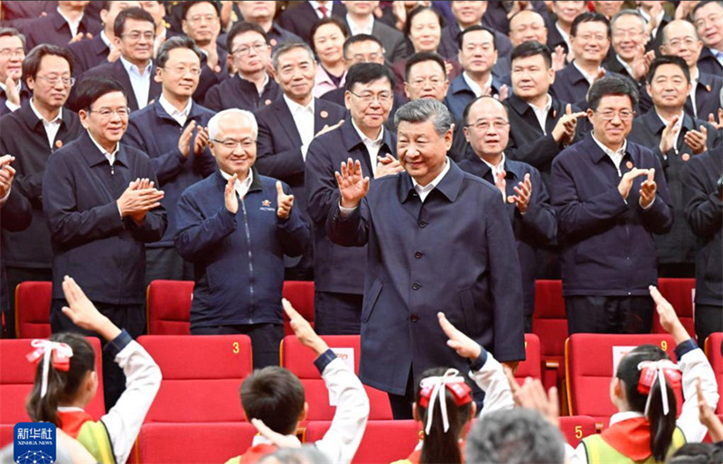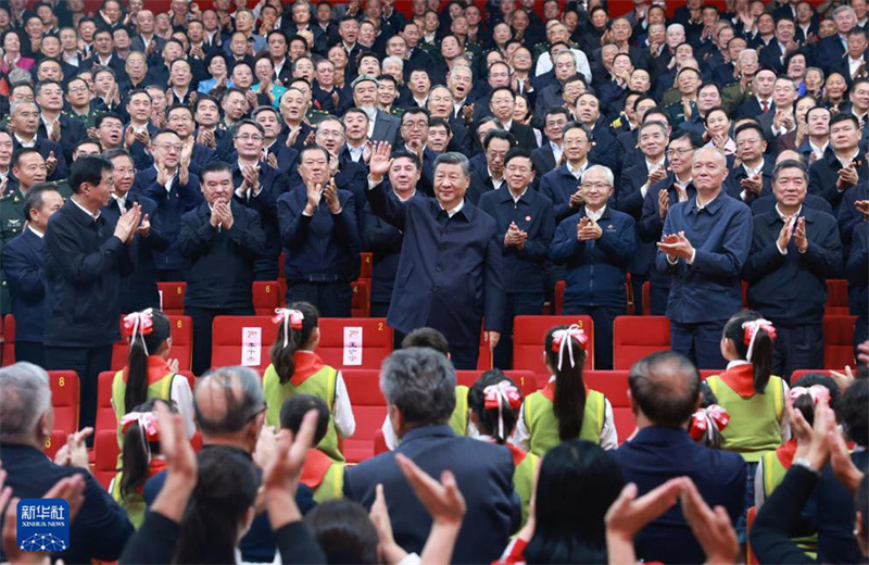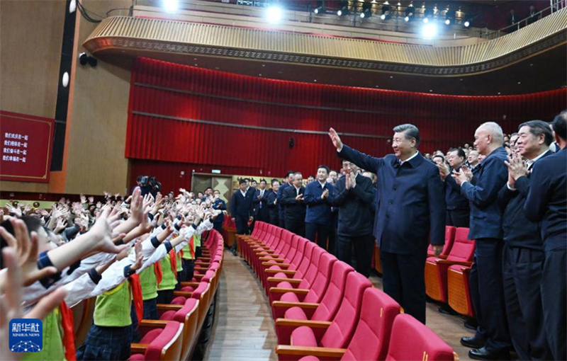王沪宁、蔡奇、李干杰、何立峰、王小洪、雪克来提·扎克尔、谌贻琴、王东峰和刘振立,在新疆工作过的老同志,以及中央和国家机关有关部门负责同志、中央代表团全体成员一同观看演出。
