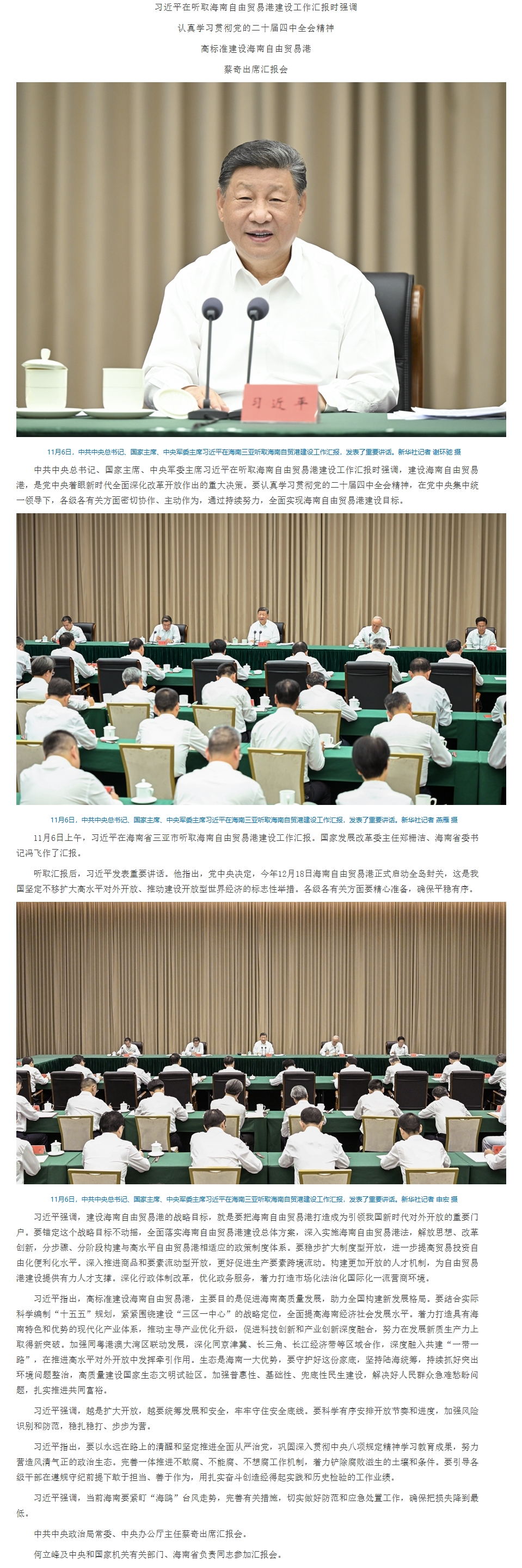 习近平在听取海南自由贸易港建设工作汇报时强调: