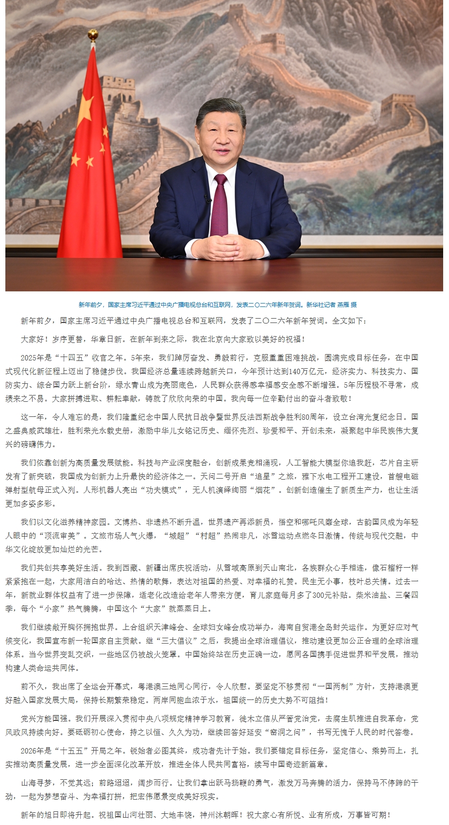 国家主席习近平发表二〇二六年新年贺词
