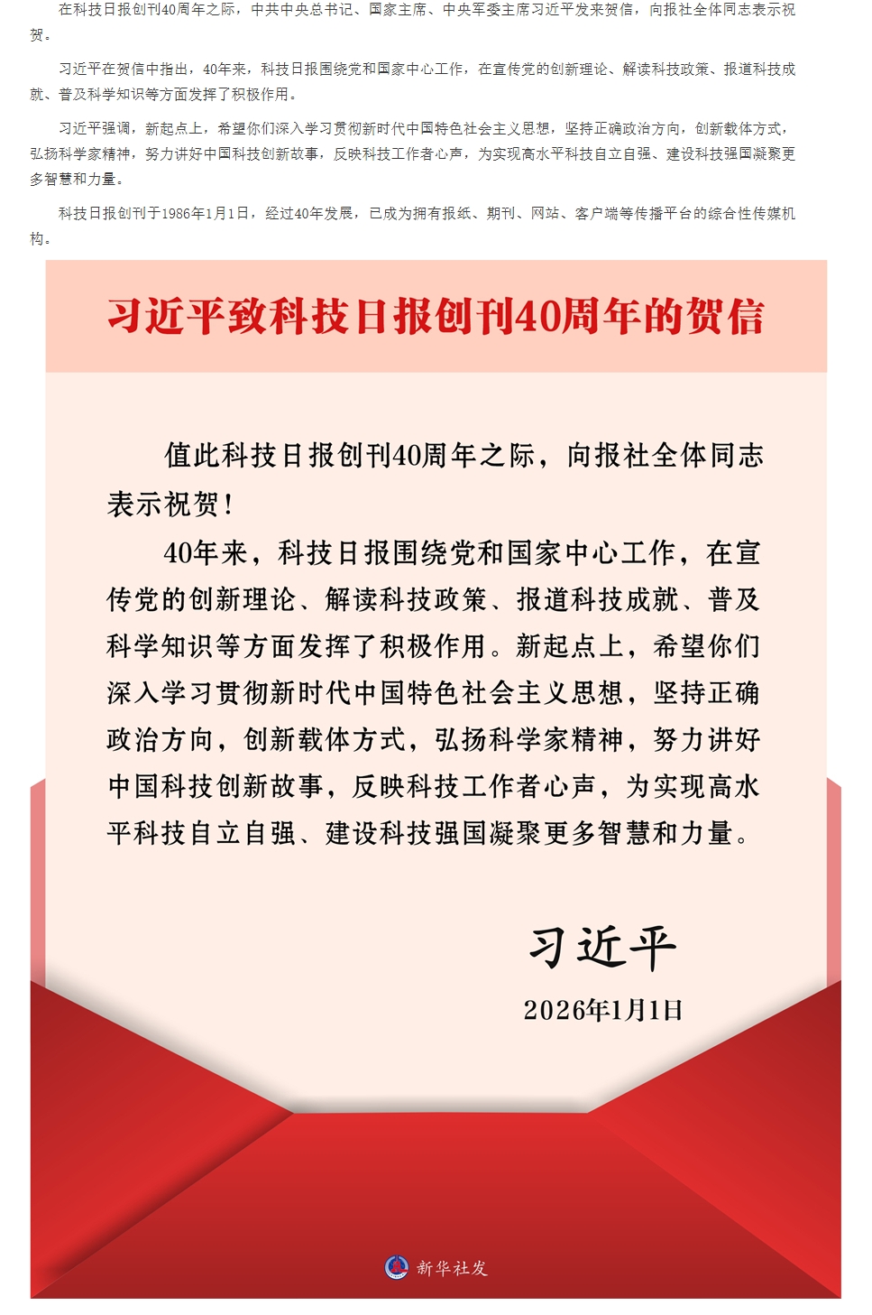 习近平致信祝贺科技日报创刊40周年强调 努力讲好中国科技创新故事 为建设科技强国凝聚更多智慧和力量