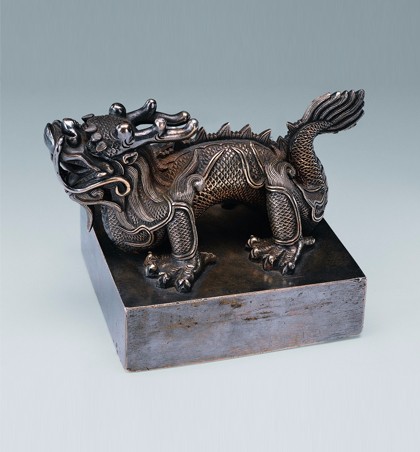 清宣统(1909-1911) 长12.7厘米 宽12.7厘米 高10厘米 银质,钮为一蹲曲的龙形,龙体刻画精细,龙形威武庄严。印面呈正方形,镌阳文满、汉两种文体的篆书“祺皇贵太妃之宝”七字。龙钮印是尊贵的象征,只有皇亲国戚才能使用,此印即...
