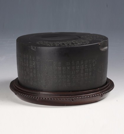 明(1368—1644) 直径18厘米 高10厘米 此砚石质苍黑纯净,石鼓形。直径18厘米,厚10厘米。砚面开月牙形水池及弧形砚堂,水池之上有“内府之宝”方印,印两侧各一篇顾从义摹刻的“石鼓文”。砚底中部纵开长方形凹面,内书“石鼓”、“...