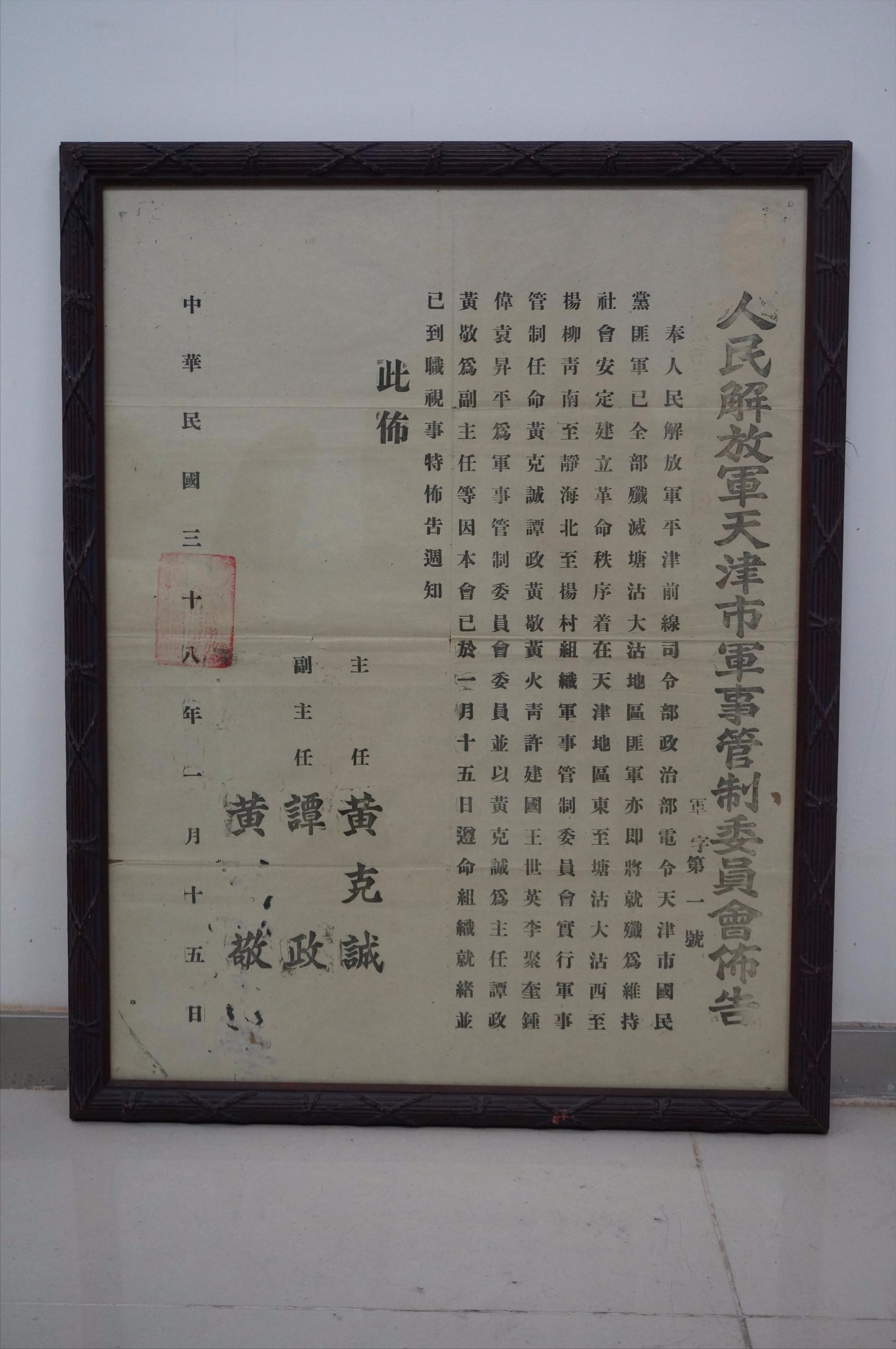 1949年1月15日,天津解放初期成立的军事管制委员会,特发军字第一号布告。其内容:天津境内的敌军全部歼灭,为稳定社会,在天津地区东至塘沽、大沽西至杨柳青,南至静海,北至杨村,组织军事管制委员会实行军事管制,任命黄克诚为主任,谭政、黄敬为副主任。包括黄克诚、谭政、黄敬、黄火青、许建国等9人为军事委员会委员,于一九四九年一月十五日就职行使职责。现收藏于天津博物馆。